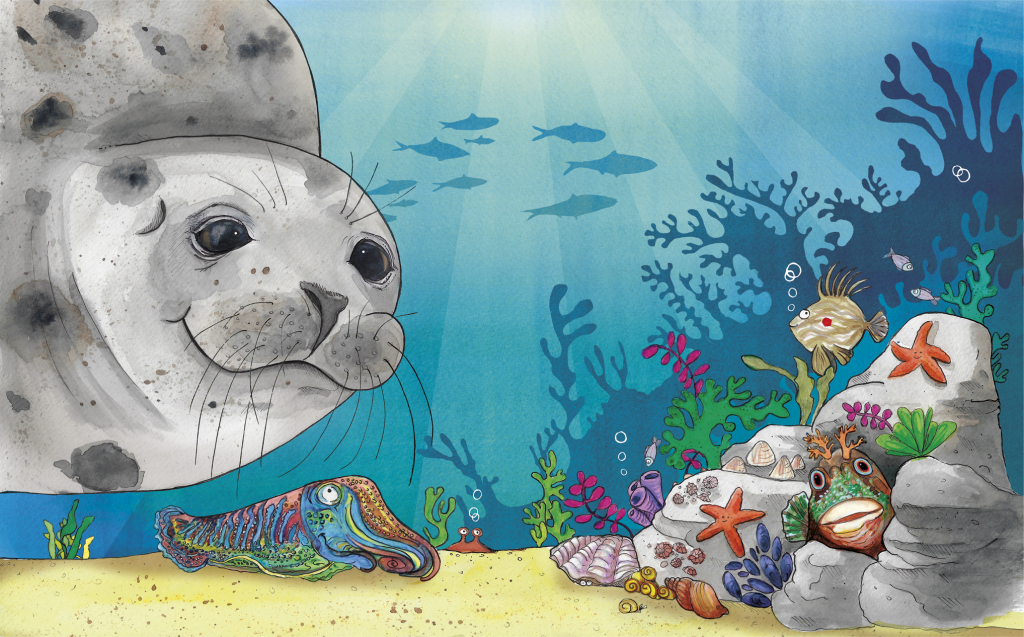 Solva is a young grey seal who enjoys adventures. She keeps bumping her head and tries to find a solution, but to no avail, until she recovers a canoeist’s lost orange hat.